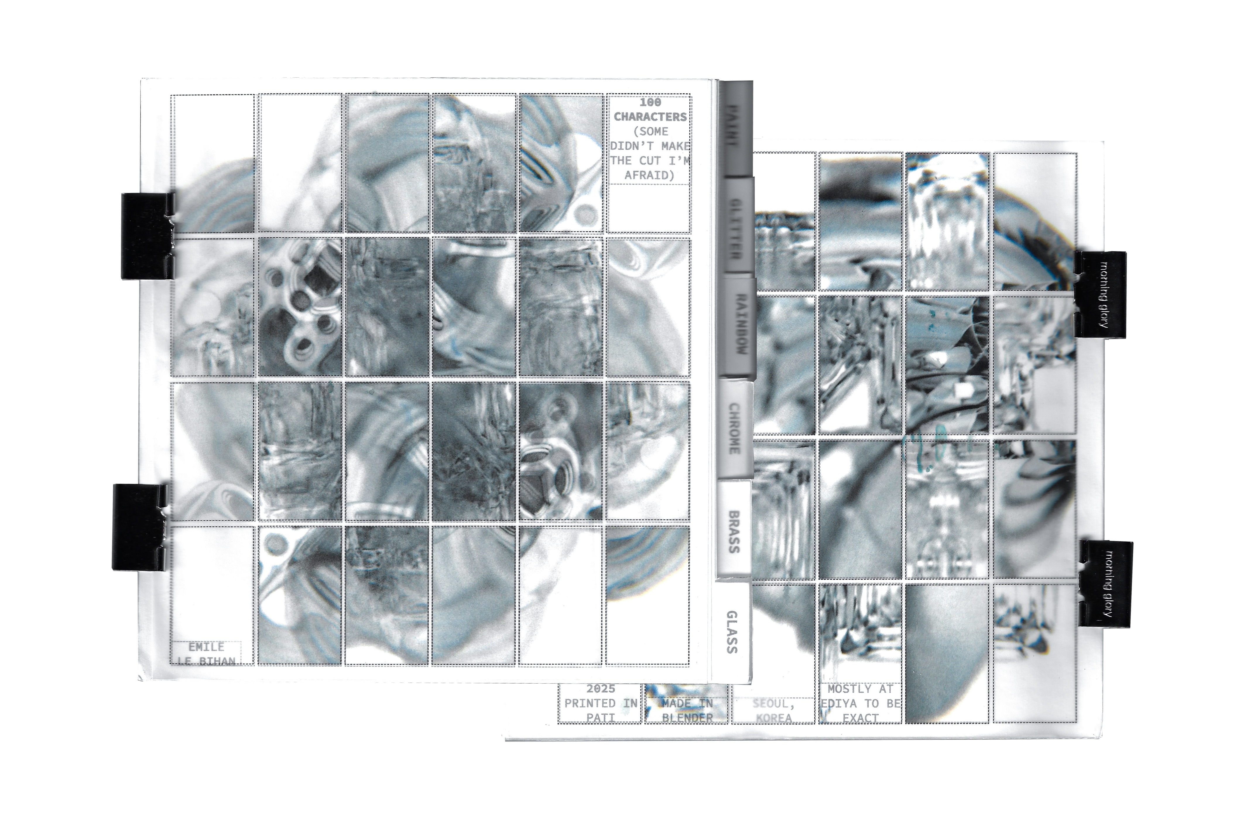 Atlas de manipulations 3D sur le radical du verbe coréen 짧다 (court). Celui-ci compile 100 déclinaisons différentes de ce hangeul dans divers matériaux; verre, chrome, paillettes, laiton…Inspiré d’atlas de minéralogie, cette édition donne à voir mes expérimentations comme à travers la lentille d’un microscope. La fonte et le matériau utilisés ainsi que les modifications appliquées au caractère sont précisées à chaque itération.